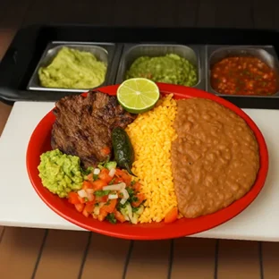 Pork meat, in salsa verde, rice, beans and 3 tortillas